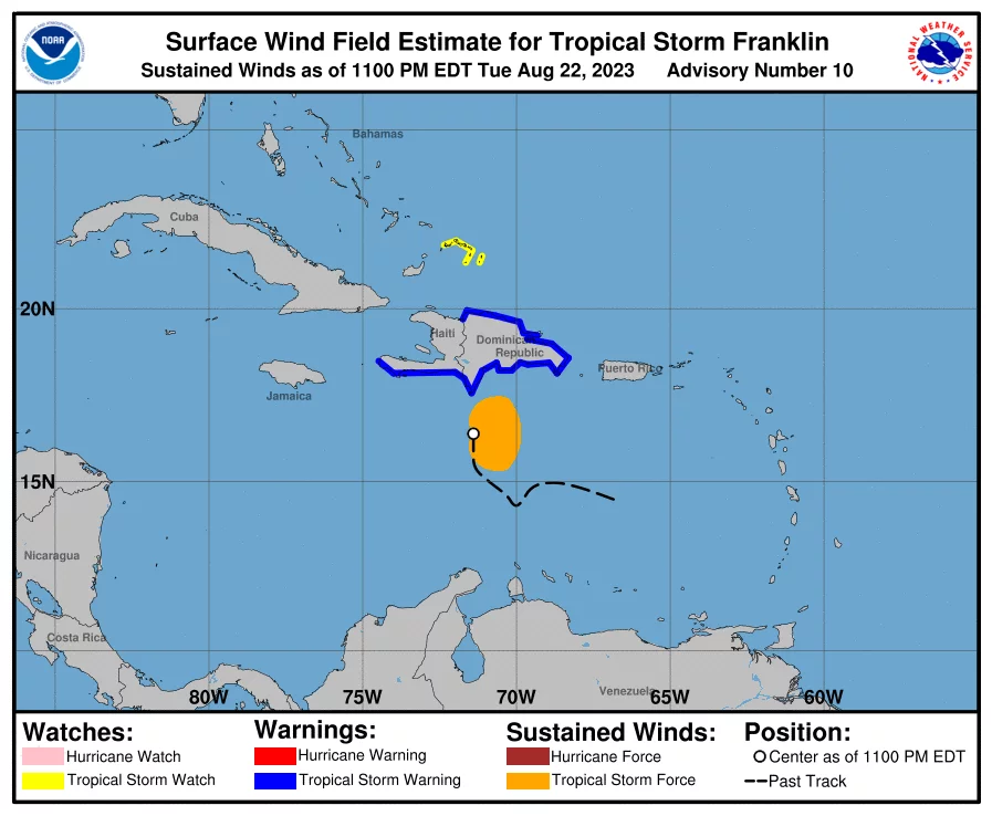 SANTO DOMINGO, RD.- Según el boletín No. 10 del Centro Nacional de Huracanes (CNH), en su actualización de las 11 de la noche del martes, localiza a la tormenta tropical Franklin con un movimiento de 9 mph, lo que es igual a 15 km/h, incrementando ligeramente su velocidad.