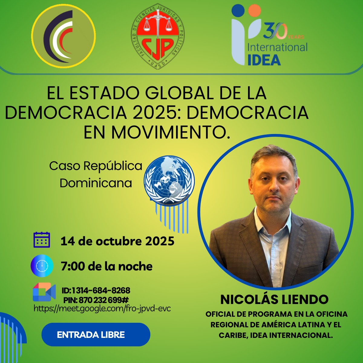 SANTO DOMINGO, RD.– El próximo martes 14 de octubre a las 7:00 p.m. se celebrará la conferencia virtual titulada «El Estado Global de la Democracia 2025: Democracia en Movimiento. Caso República Dominicana», a cargo de Nicolás Liendo, oficial de programa de la Oficina Regional de América Latina y el Caribe del Instituto para la Democracia y la Asistencia Electoral (IDEA Internacional). Esta actividad está siendo organizada por el Instituto Dominicano de Derecho Procesal y la Facultad de Ciencias Jurídicas y políticas de la Universidad Autónoma de Santo Domingo.