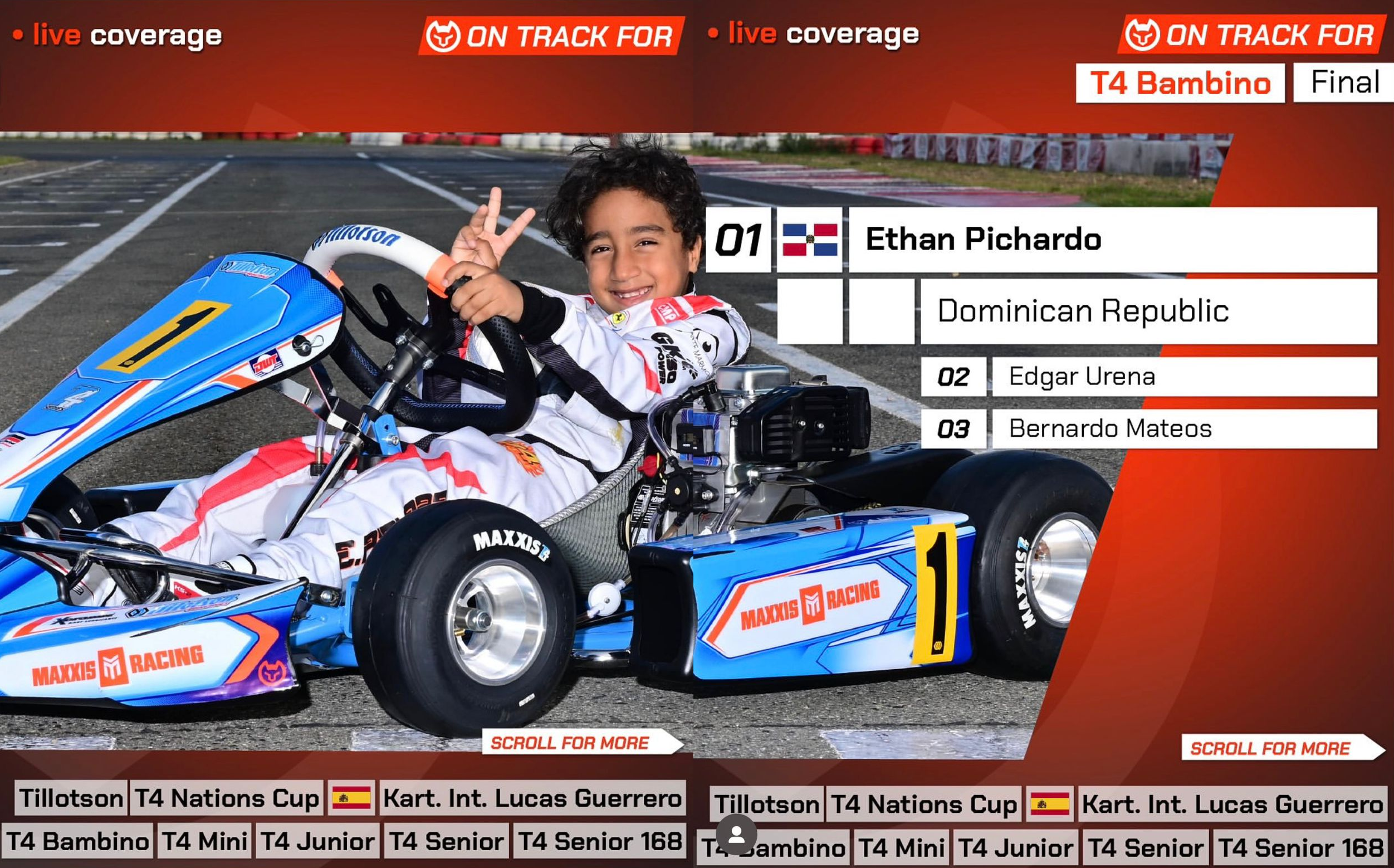 SANTO DOMINGO, RD.- Con solo 6 años y siendo el más pequeño del grupo, el niño Ethan Pichardo Bello se convirtió en primer campeón Mundial de la Copa T4 Nations en la categoría Bambino de cartismo celebrado desde el pasado 1 al 5 de octubre en la ciudad de Valencia, España en el kartódromo internacional Lucas Guerrero.
