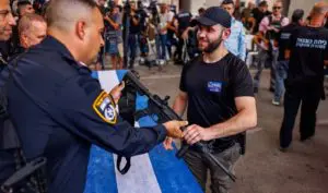 Un oficial entrega a un voluntario israelí un arma de guerra.